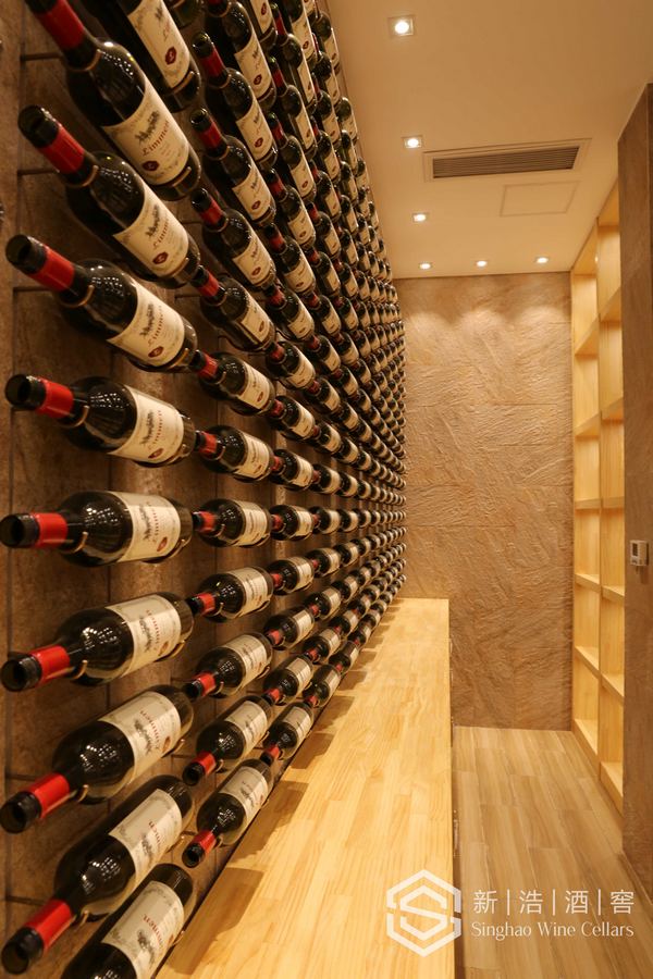 酒窖拥有3.5米天花标高,此酒窖的建成刷新了深圳市别墅地下室私藏酒窖的标高记录。墙壁上的金属拖架,将每一瓶佳酿完美的展现出来。金色拉丝不锈钢保温玻璃隔断使整个酒窖表现得更加时尚大气,也使地下室看起来更有空间感。