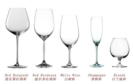 饮用不同类型的葡萄酒也需要不同的杯型。红葡萄酒酒杯的杯肚都比较圆润,杯口相对较宽,这样有利于我们更加敏锐的感觉葡萄酒不断变化的酒香。其中,最有特色的即是勃艮第杯和波尔多杯。白葡萄酒酒杯的杯肚多呈U型,垂直的。这样的杯形有利于释放葡萄酒的香气,同时还可以有效地保持白葡萄酒已冰冻的温度。起泡酒杯呈直立的,其突出的特点是杯身细长,可以给气泡预留出足够的上升空间。白兰地适合矮小的杯体,因为白兰地是蒸馏酒,有相对较高的酒精度,所以应该使用稍微小一点的酒杯,这样可以饮用较少的酒。如下图: