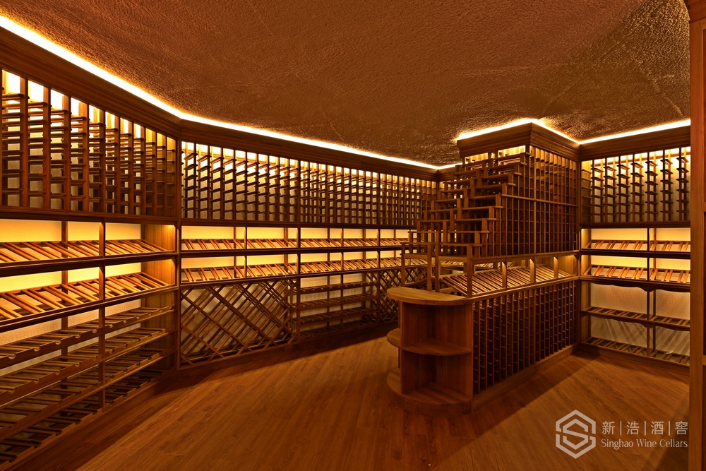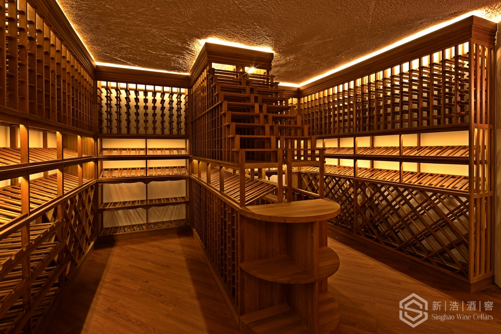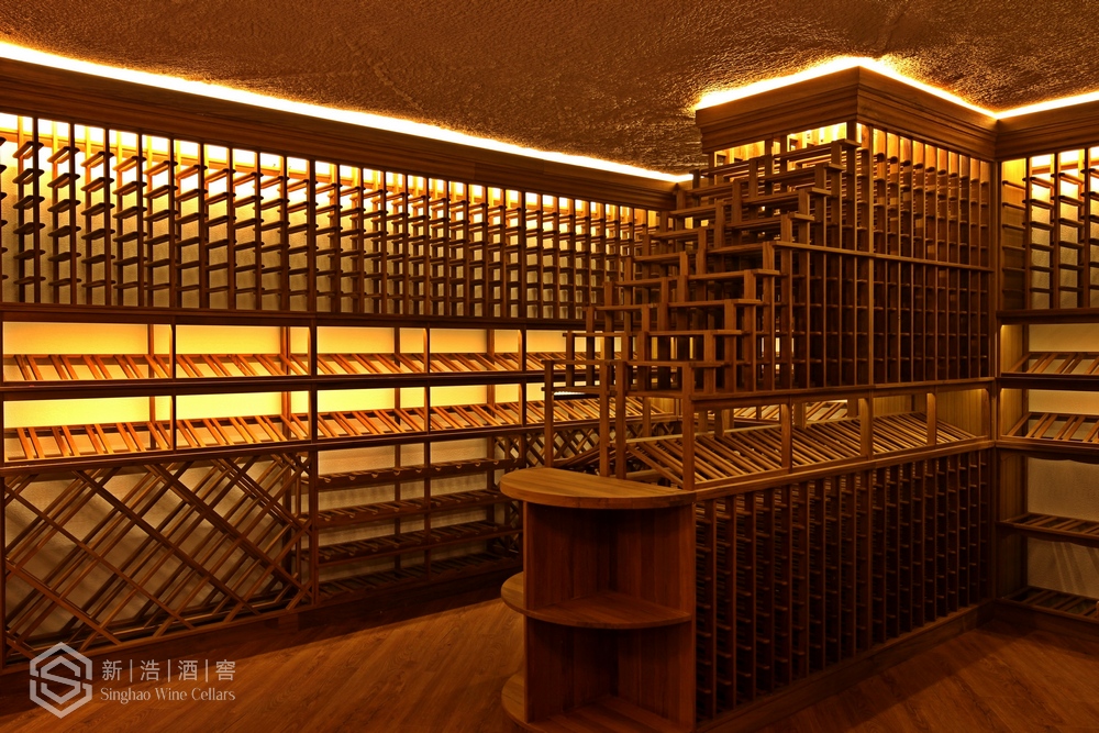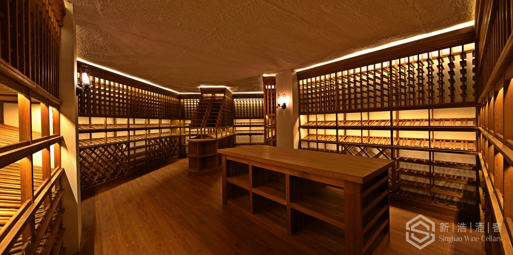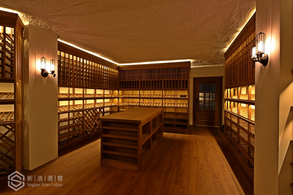 该酒窖整体面积48平方米,所有的木饰面均采用精选的天然柚木;天花没做吊顶设计,而是直接在酒窖保温层表面上喷涂岩石漆,使其既有天然洞穴般的粗犷感,又最大限度保留了酒窖的层高。酒架紧贴酒窖四周的墙壁,酒架顶部暗藏的LED光源,清晰地勾画出整个酒窖空间的轮廓。